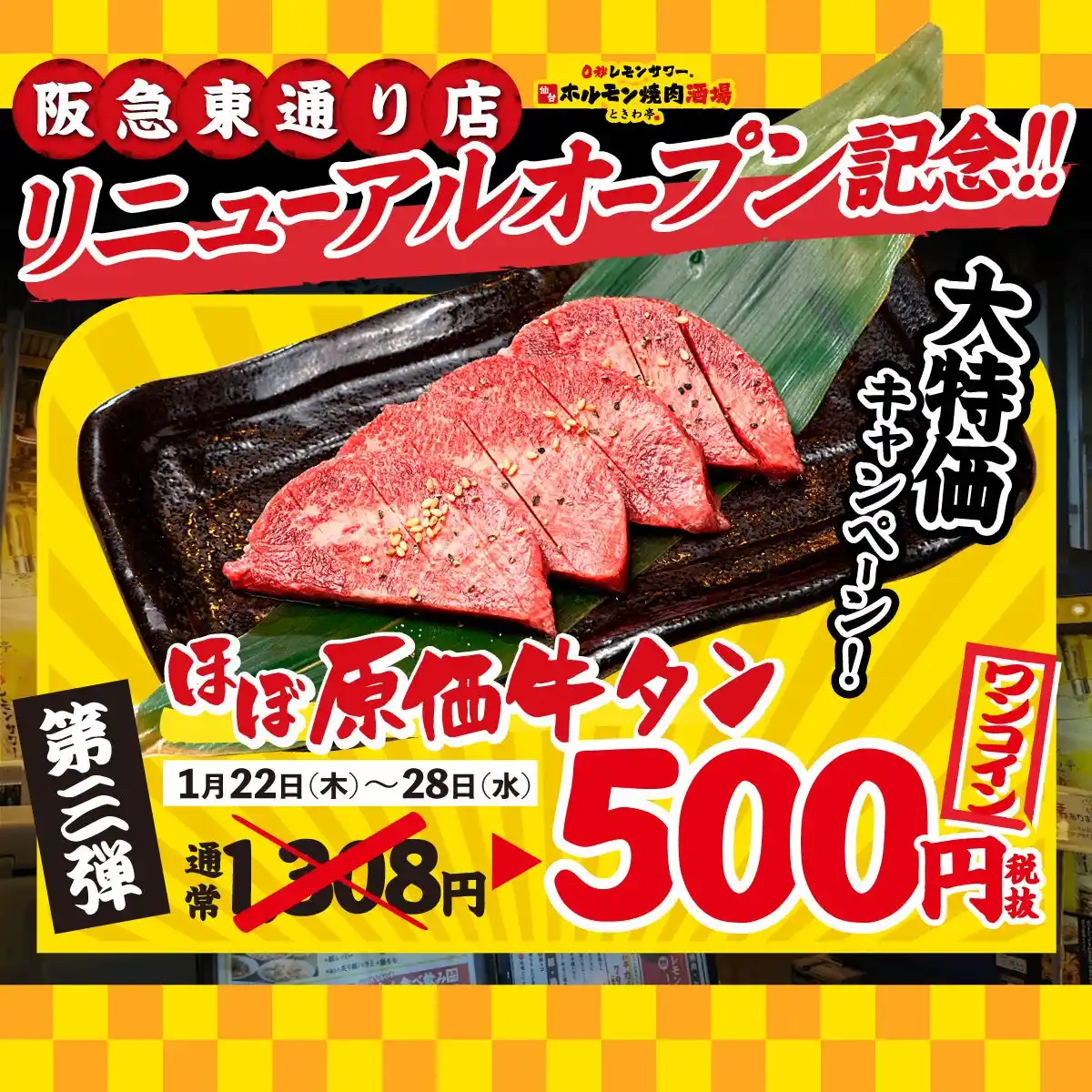 当店は、2021年3月にオープンし、これまで多くの方に愛顧いただいてきました。2026年1月8日(木)にリニューアルオープンします。リニューアルを記念し、3週連続でお得なキャンペーンを開催します。第一弾は、1月8日(木)から1月14日(水)まで、ときわ亭名物「仙台塩ホルモン」を29円(税抜)で提供。第二弾は、1月15日(木)から1月21日(水)まで、「黒毛和牛上カルビ」をほぼ原価の500円(税抜)でお楽しみいただけます。さらに、第三弾は1月22日(木)から1月28日(水)まで、「ときわ亭牛タン」をほぼ原価の500円(税抜)で提供いたします。 |
