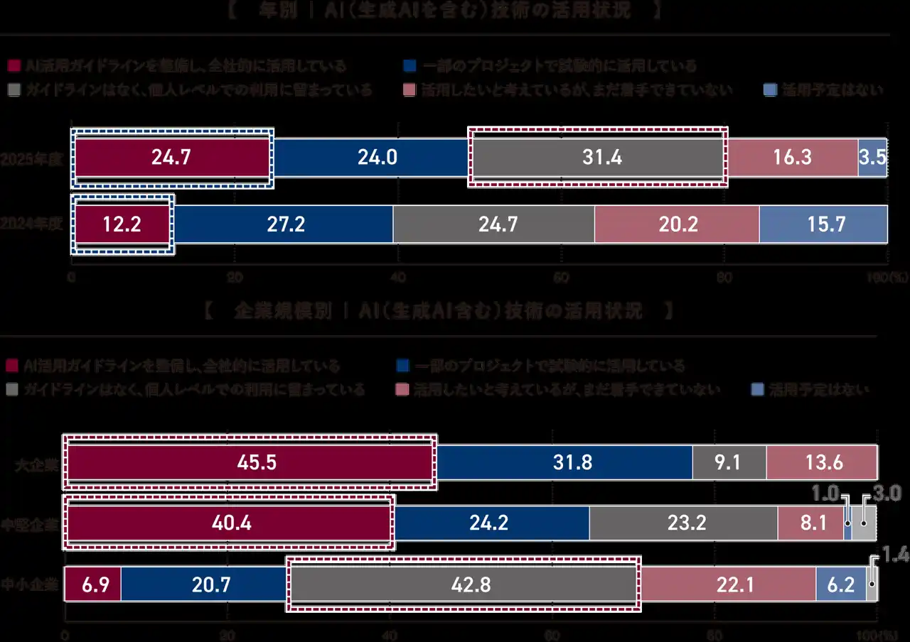 (3) AI活用についての設問では、「全社的に活用」が2024年の12.2%から2025年は24.7%に上昇しました。その一方で「ガイドラインはなく、個人レベルでの利用に留まっている」(31.4%)が最も多く、また「活用予定はない」は3.5%にとどまりました。 |
