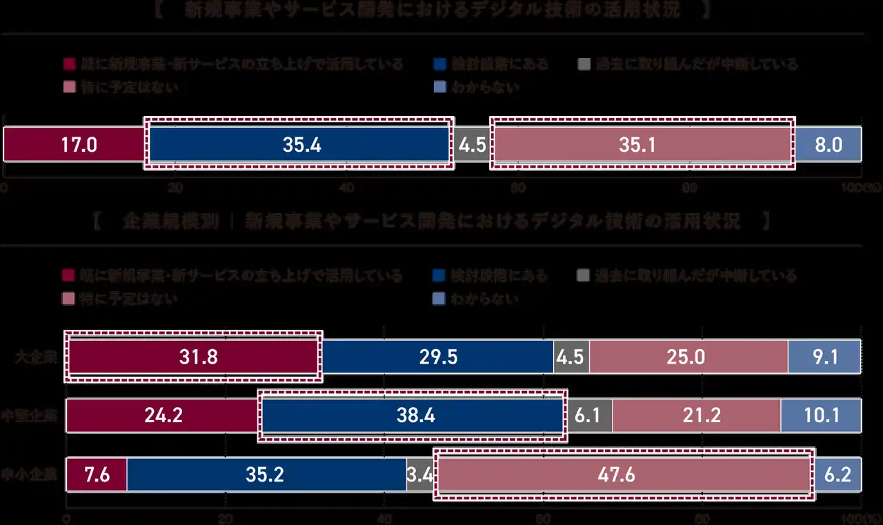 全体では、「検討段階にある」(35.4%)が最も多く、「特に予定はない」(35.1%)がほぼ同水準で続きました。「既に新規事業・新サービスの立ち上げで活用している」は17.0%にとどまり、実際に活用まで進んでいる企業は2割弱となっております。 |