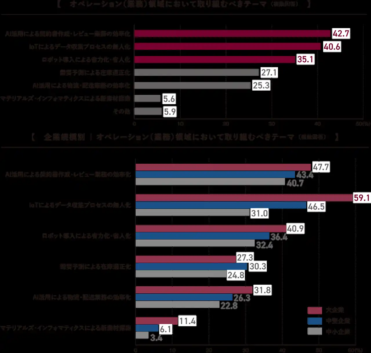 企業規模別にみると、大企業では「IoTによるデータ収集プロセスの無人化」(59.1%)が突出して高く、現場データの自動取得や可視化を通じて業務効率や判断精度の向上を図る動きがみられます。全体として、オペレーション領域では、AI・IoT・ロボティクスを中心に、効率化・自動化への取り組みが重点テーマになっております。 |