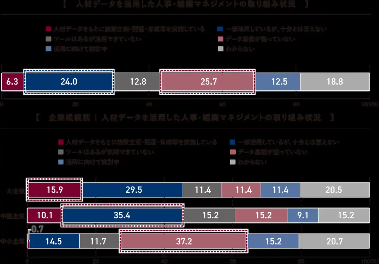 全体では、「データ基盤が整っていない」(25.7%)が最も多く、次に「一部活用しているが、十分とは言えない」(24.0%)が続きました。「人材データをもとに施策立案・配置・育成等を実施している」は6.3%にとどまり、人材データを活用できている企業は限られていることが分かります。 |