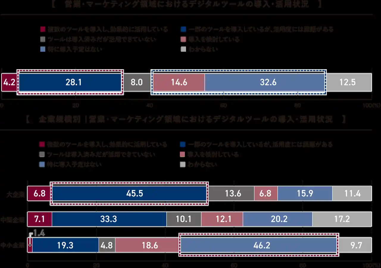 全体では、「一部のツールを導入しているが、活用度には課題がある」(28.1%)が最も多い結果となりました。また、「導入を検討している」(14.6%)と「特に導入予定はない」(32.6%)を合わせると、導入が進んでいない企業が半数近くを占めます。「複数のツールを導入し、効果的に活用している」は4.2%にとどまり、ツールの有効活用はごく一部に限られていることが分かります。 |