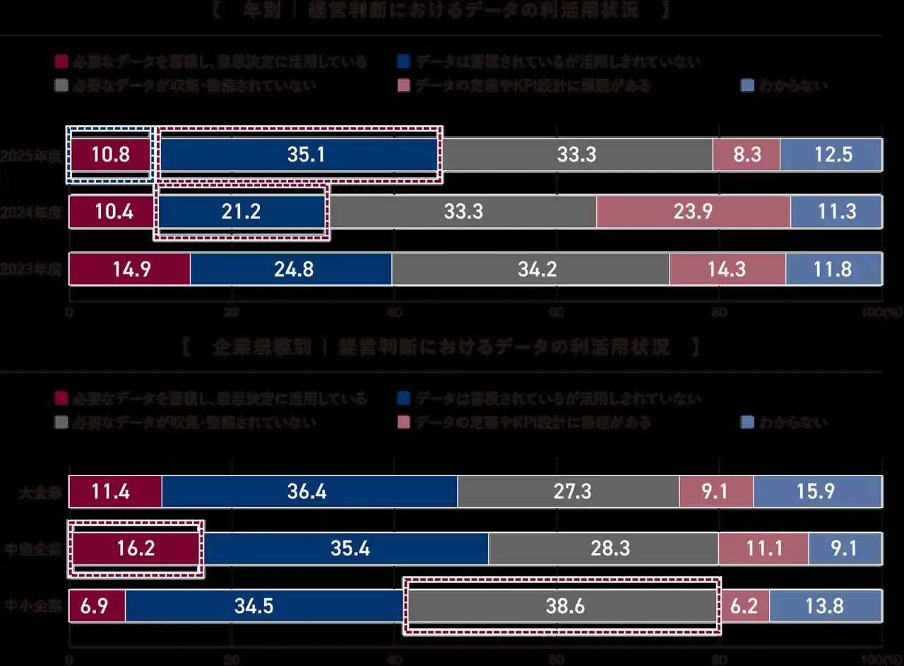 年次比較では、「データは蓄積されているが活用しきれていない」が21.2%(2024年)から35.1%(2025年)へ上昇しており、データは整備されつつも活用に至っていない企業が増加していることが分かります。 |