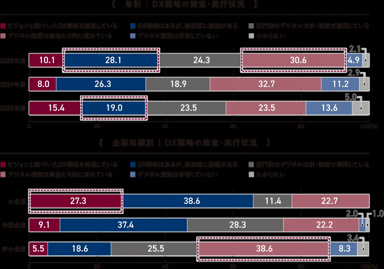 全体では、「デジタル施策は場当たり的に進めている」(30.6%)が最も多く、「DX戦略はあるが推進度に課題がある」(28.1%)が続きました。「DX戦略はあるが推進度に課題がある」の回答率は2023年19.0%から2025年28.1%へ上昇しており、実行段階の企業が増加していることが分かります。一方で、「ビジョンと紐づいたDX戦略を推進している」は約1割にとどまりました。 |