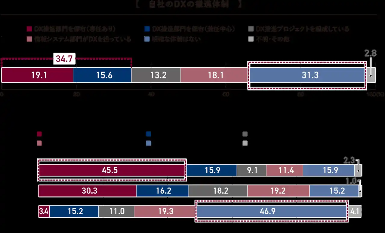 (3)大企業では半数近くが「DX推進部門を保有(専任あり)」と回答。企業規模でDX推進体制に差。 |