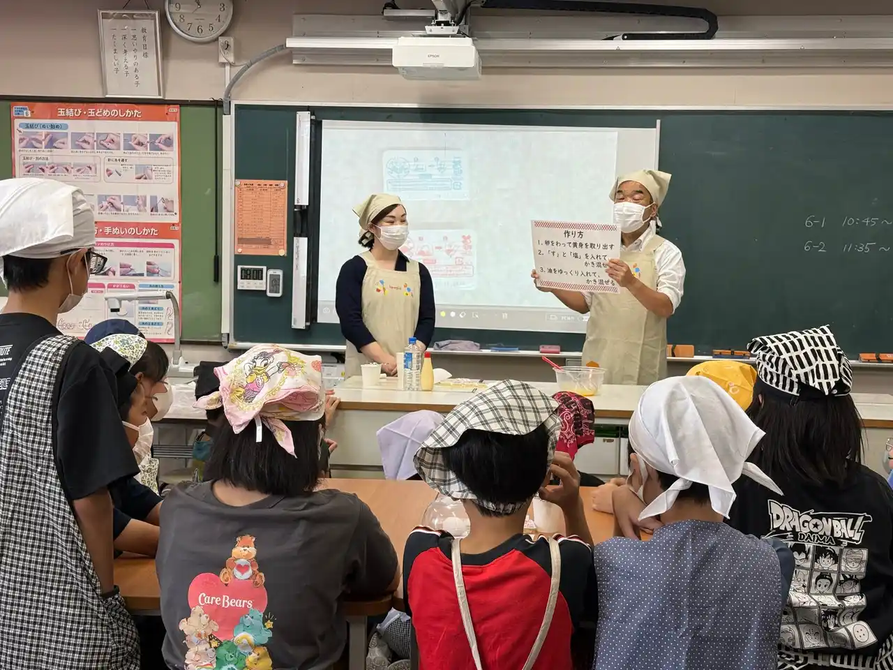 キユーピー マヨネーズ発売100周年の2025年に、社長の高宮が、自身の母校であり開校105周年を迎えた墨田区立小梅小学校(東京都)を訪問し、6年生の児童を対象に「マヨネーズ教室」の講師を務めました。マヨネーズの歴史や乳化の仕組みを伝えるとともに、キユーピーグループが取り組むSDGs(目標12:つくる責任 つかう責任)についても紹介しました。児童たちがマヨネーズ作りに挑戦し、手作りマヨネーズをブロッコリーと一緒に試食することで、「苦手な野菜が食べられた!」という喜びの声があがりました。未来を担う子どもたちに食の楽しさと大切さ、そして記憶に残る学びを伝えました。 |