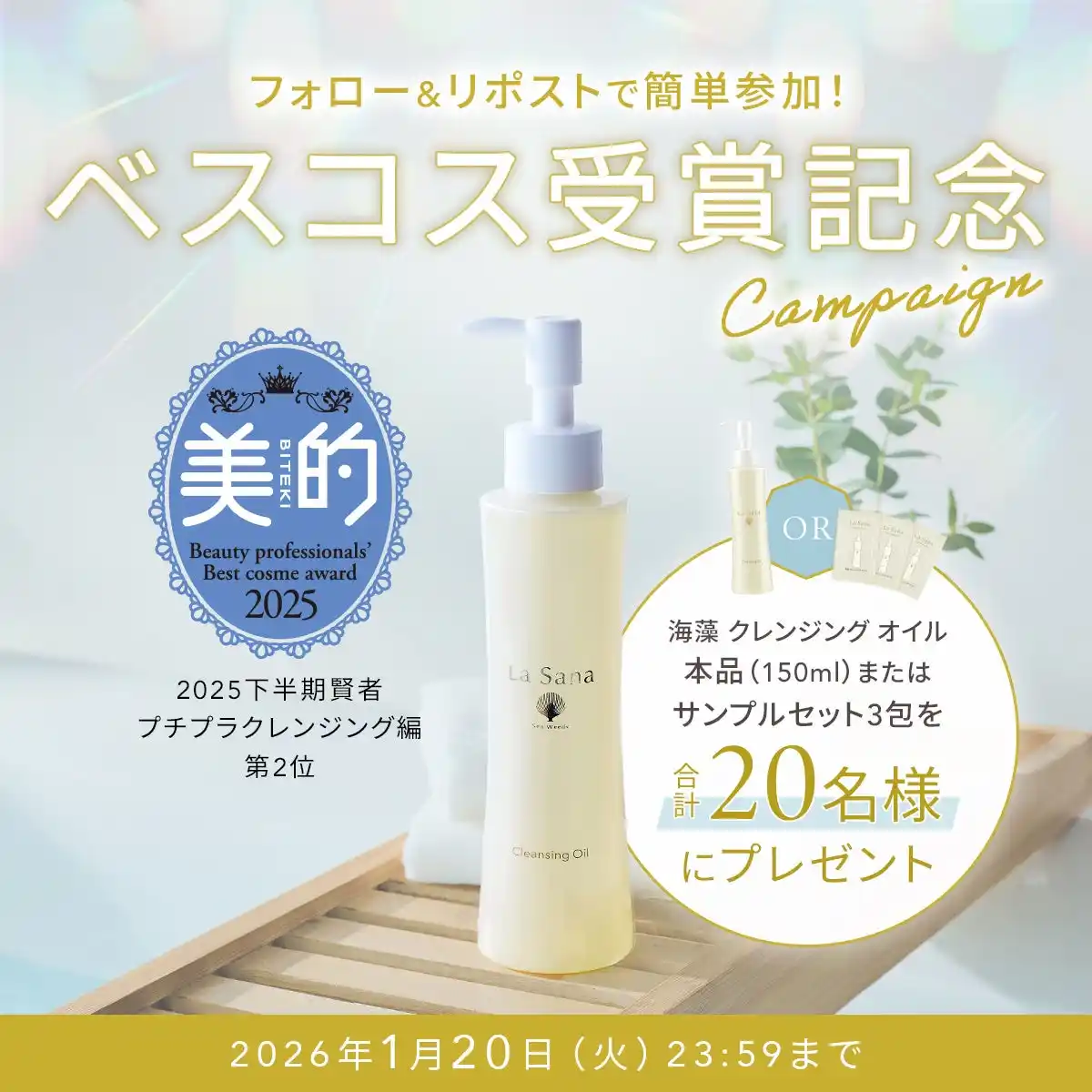ヘアトリートメント カウンセリング 国内売上No.1(※1)の海藻コスメブランド「ラサーナ」を展開する株式会社ヤマサキ(本社 : 広島市、代表取締役 兼 CEO : 土肥 光)は、2025年9月1日(月)に発売したスキンケアラインのうち『ラサーナ 海藻 クレンジング オイル』(150ml・140ml)が、ラサーナのスキンケアライン約40年の歴史の中で初のベストコスメを受賞したことをお知らせします。また、これを記念したプレゼントキャンペーンをラサーナ公式Xにて2026年1月6日(火)より実施いたします。 |