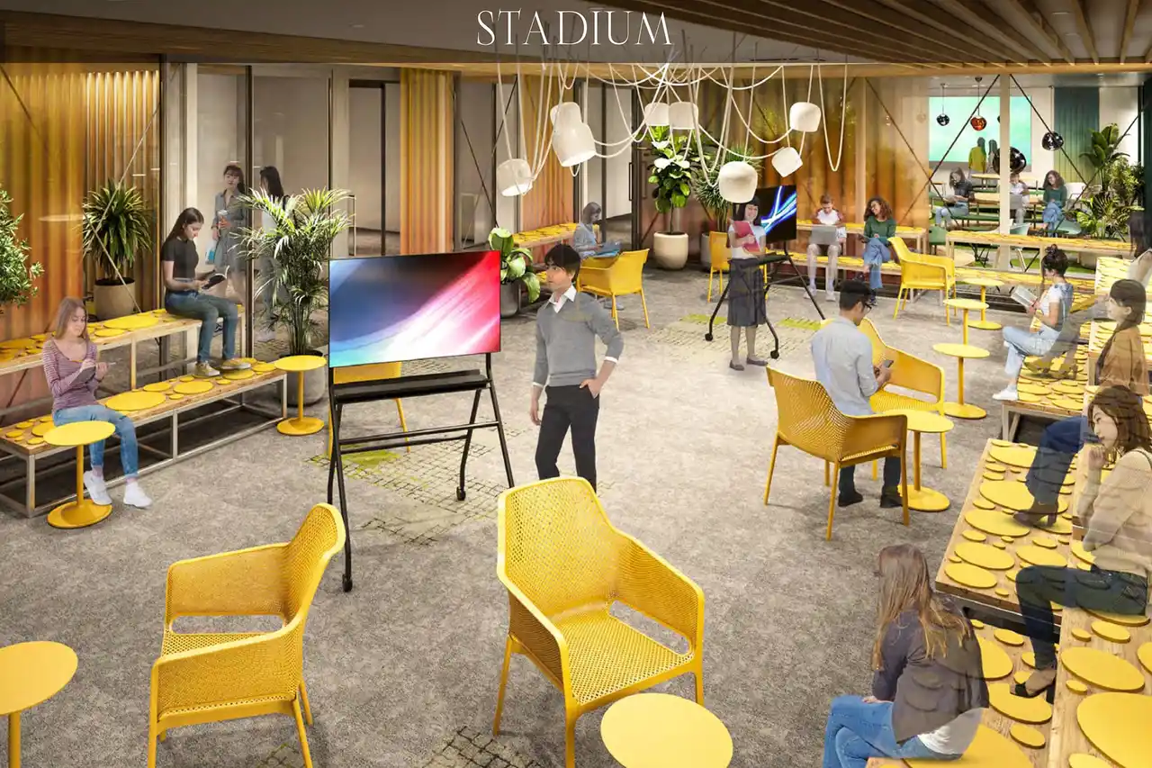 FINDER STADIUM:最大60名を収容できる、階段状のベンチを備えたスタジアム型空間です。ここでは授業だけでなく、TEDのようなプレゼンテーションやディスカッションが行われます。ガラス越しに外部からも視認できる設計により、程よい緊張感の中で「発信する力」と「表現する力」を養います。 |