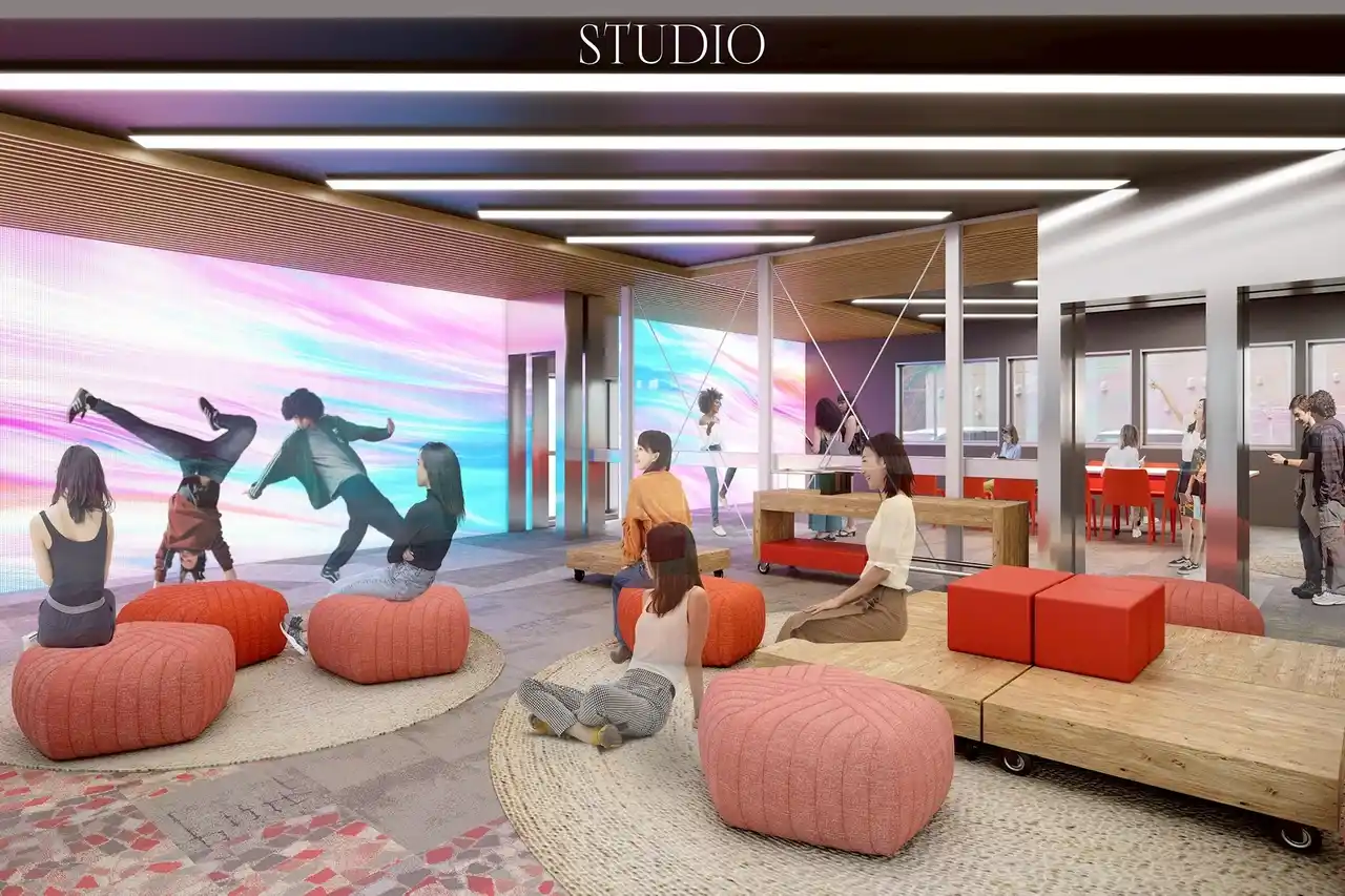 FINDER STUDIO:壁一面に大型LEDビジョンを配した、プロ仕様のクリエイティブスタジオです。ダンスや演劇のパフォーマンス、映像制作、オンライン配信など、デジタルデバイスを駆使した表現活動が可能。保護者向け説明会や産学連携イベントなど、社会に向けたアウトプットの場としても機能します。 |