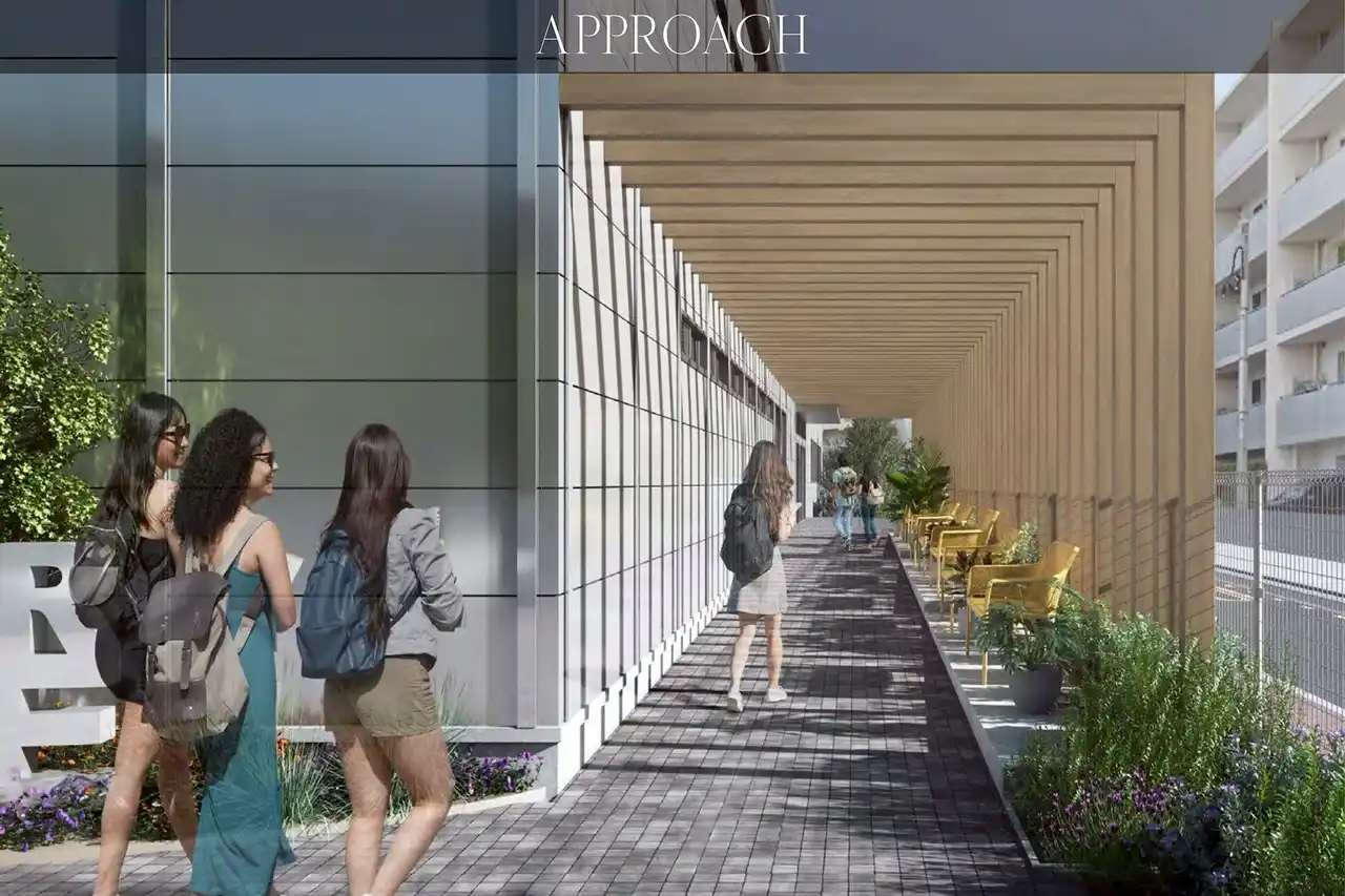 FINDER GATE:朝日が差し込むパーゴラ型ゲートが象徴的なエントランス。登校を「始動・出発」として演出。 |