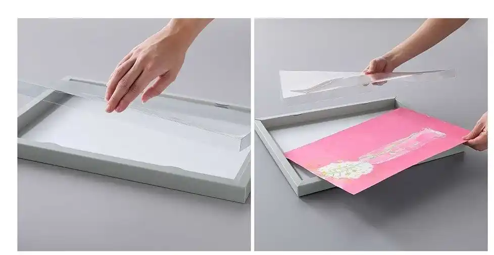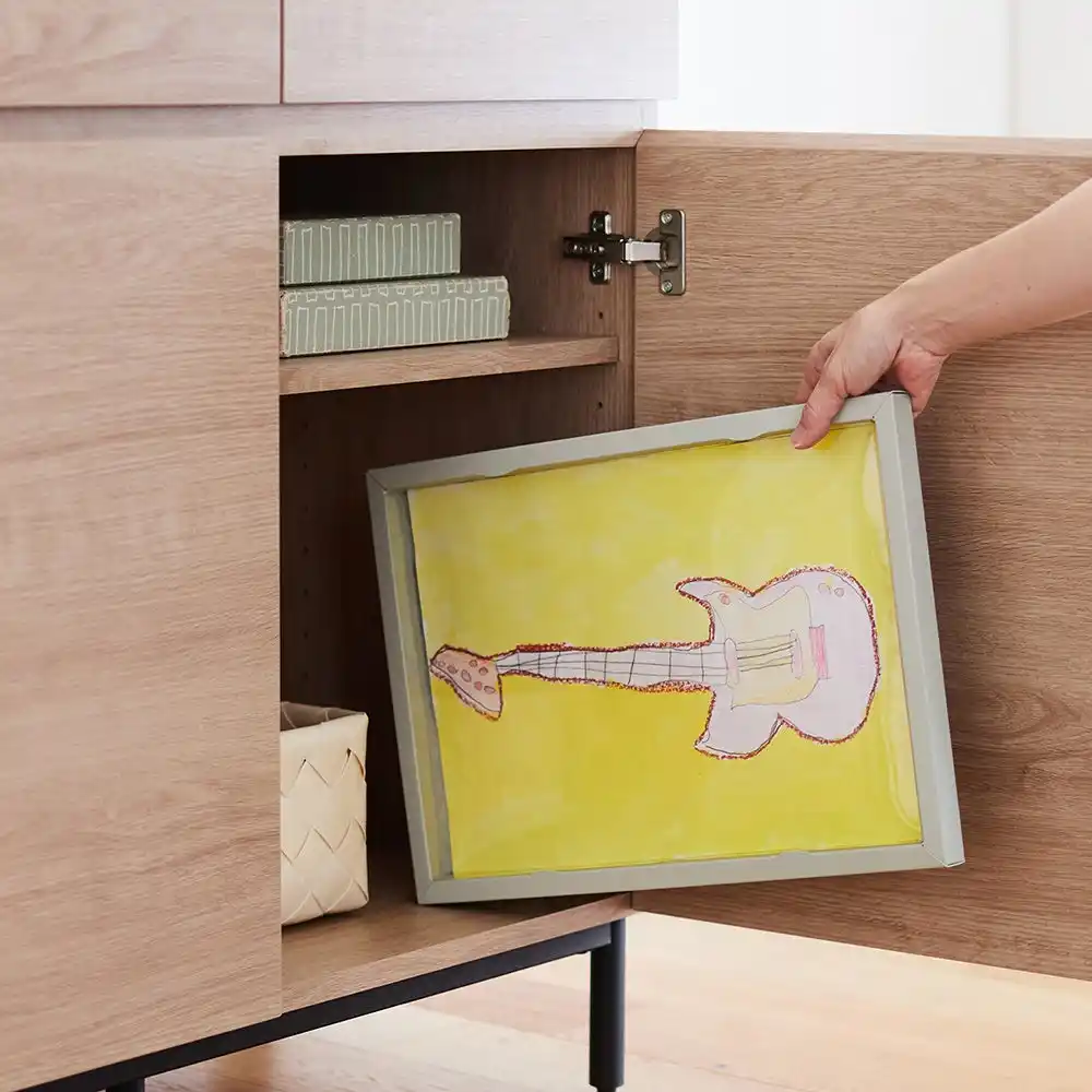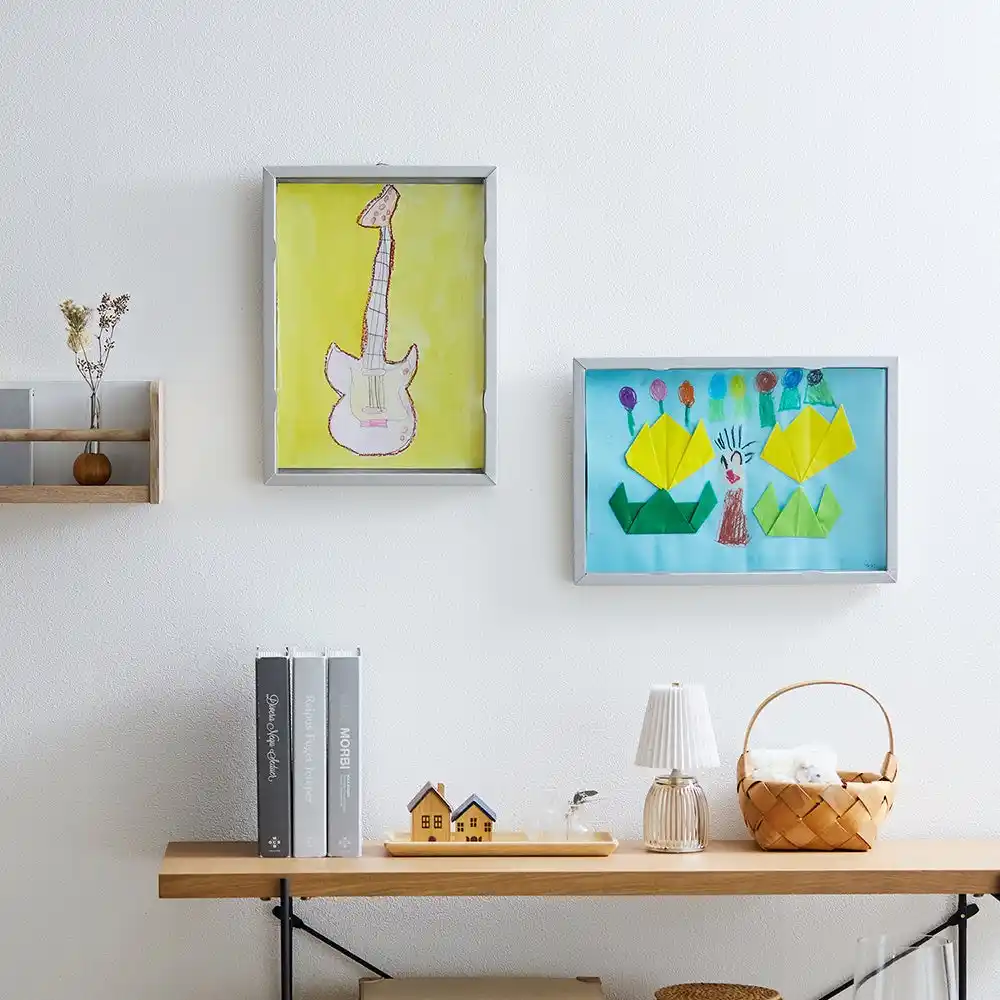 「収納しながらアートのように飾れる作品収納」は、「子どもの絵を飾りたいけれど、収納も難しく見栄えも気になる」という保護者の悩みに応えて開発されました。作品をきれいに展示できるアートフレームの役割と収納機能を兼ね備えています。しっかりとしたフレームは、八つ切り画用紙で最大25枚まで収納でき、透明のフタを開閉するだけで収納や作品を簡単に入れ替えることができます。また内寸の厚みが2cmあるため、画用紙などの平面作品だけでなく、折り紙など立体的な作品の収納にも活用可能。縦横どちらでも壁掛けできる仕様で、リビングにも馴染むギャラリーのような空間を演出します。 |