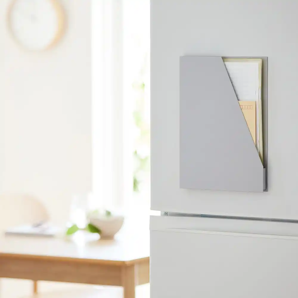 「マグネット書類収納ケース」は、裏面にマグネットを内蔵しており、冷蔵庫や玄関扉など、日常の生活動線上に書類の「定位置」を簡単に作ることができます。提出期限のある書類などを目立つ場所に収納することで、出し忘れや提出忘れを効果的に防ぎます。 |