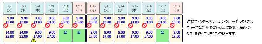 翌日に早番を入れるといったことを防げます。 |