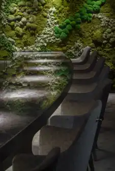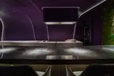 大胆な模様で弓形の形状をした天然大理石のカウンターの上には、座席数と同じ10灯の小型スポットライトを配置し、その光はカウンター上の料理に焦点を定め照らしています。カウンター正面にはオープンキッチンがあり、シェフが卓越した腕前でフランス料理を調理する様子を楽しむことが出来ます。また、カウンター両側の壁面はドライモスのアートワークで覆い、紫の空間と調和させました。 |
