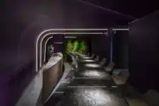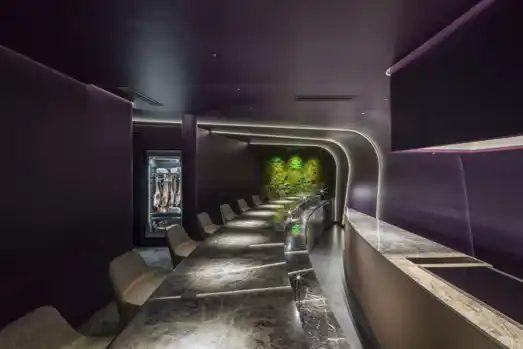 異次元をテーマとした、席数僅か10席のイノベーティブフレンチを楽しむための特別な空間です。グレージュやシャンパンゴールドといった柔らかな色調の1階のウェイティングルームで暫しの時間を過ごした後、階段より2階へ進むと、眼前には紫色の異次元空間が広がります。天井と壁がシームレスに繋がった7枚の紫色のスキンで空間全体が覆われ、それぞれのスキンは重なり合い、そのわずかな隙間に間接照明を仕込み、紫色のスキンを幻想的に照らしています。