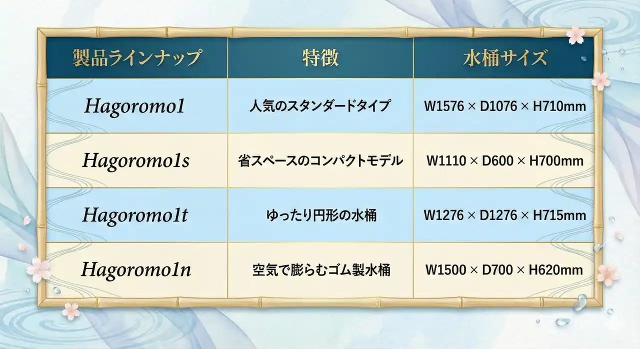 ゴム製の「1n」を除き、「Hagoromo1」シリーズは、バスタブ・チラーともにフレームにはレッドシダーを採用。宿泊施設・スパの空間になじむスタイリッシュな外観で「体験価値の底上げ」に寄与します。 |