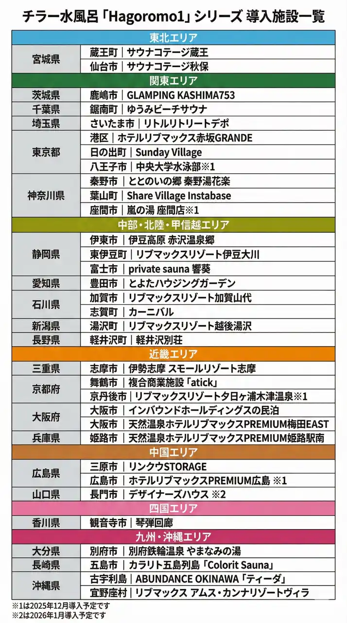 2025年10月には国内有数のリゾート運営会社・カトープレジャーグループが静岡県の「伊豆高原 赤沢温泉郷」にバレルサウナと合わせて「Hagoromo1t」を導入。 |