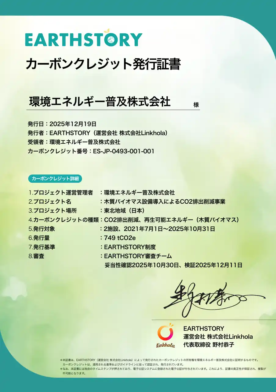 株式会社Linkhola(代表取締役:野村恭子、以下「Linkhola」)が運営するボランタリークレジット創出支援サービス『EARTHSTORY』(以下、「EARTHSTORY」)は、新しい領域として木質バイオマスエネルギー由来のクレジットプロジェクトのクレジットを発行しました。 |