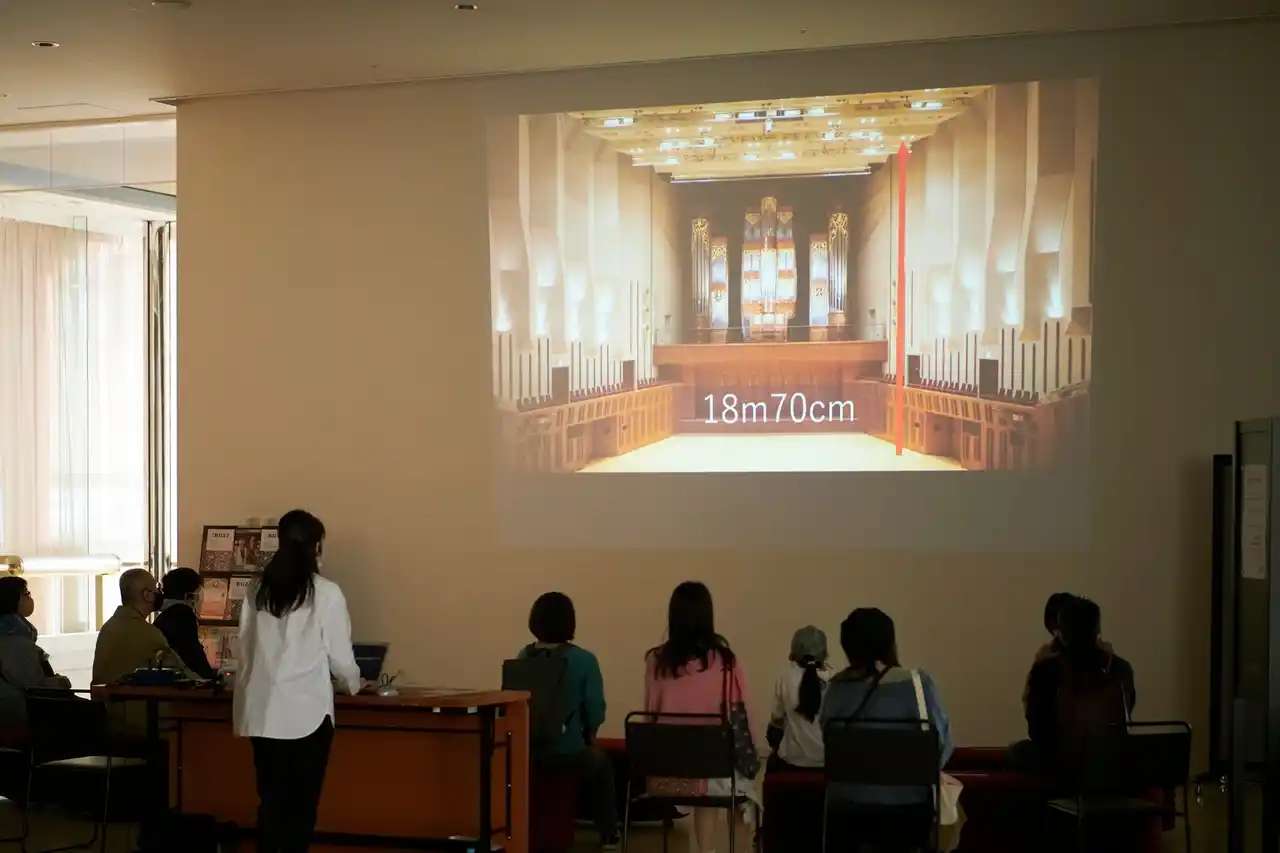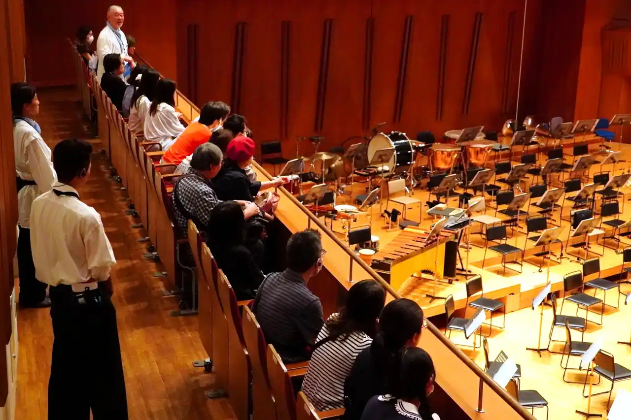 館内に展示されている数々の美術品、各ホールについてご紹介した後、ホールに入り中の様子をご覧いただきます。個性豊かなツアーガイドの案内で、劇場の魅力をたっぷり感じられる1時間のツアーです。今回は公演前のコンサートホール客席に入り、公演に向けてオーケストラのセッティングがされたステージを見ながら、ホールの機構や音の響きなどについて解説します。 |