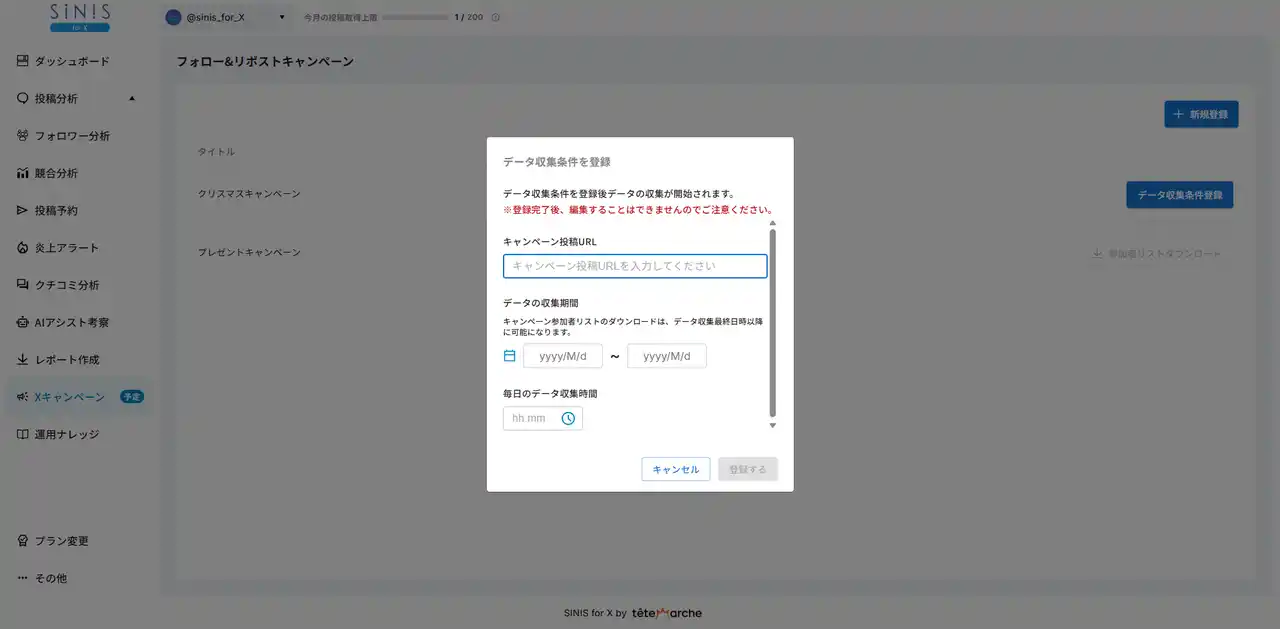 | 企業向け SNSマーケティング支援を中心としたビジネス展開をするテテマーチ株式会社(本社:目黒区、代表取締役:上田 大介)が運営するX分析・運用支援ツール「SINIS for X(サイニスフォーエックス)」は、X(旧Twitter)上で実施されるフォロー&リポストキャンペーンに特化した新機能「フォロー&リポストキャンペーン機能」を2025年12月23日(火)に提供いたします。 | |||