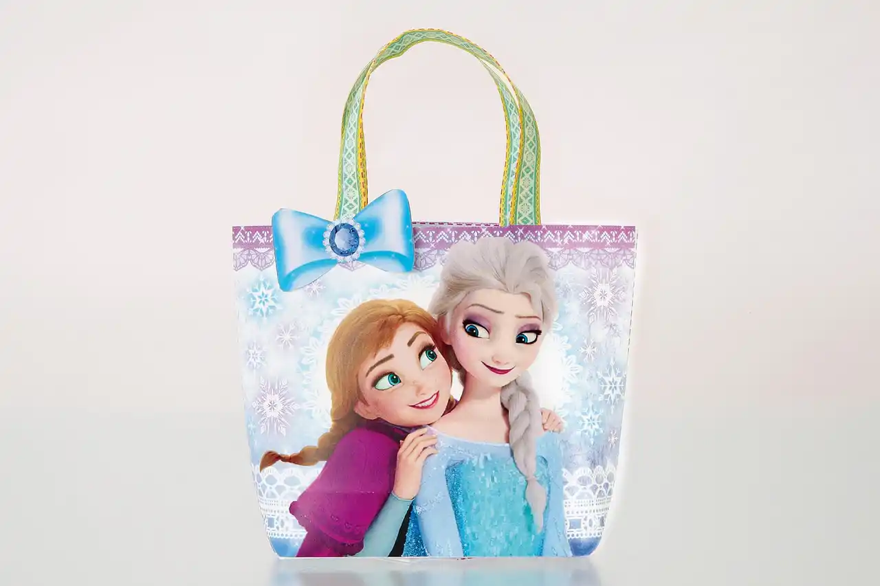 | 大きなリボンがとってもかわいい、紙工作のトートバッグです。バッグの表と裏には、仲良しなエルサとアナが! 持ち歩いたり、小物入れにしたりして使えます。 | |||||||||