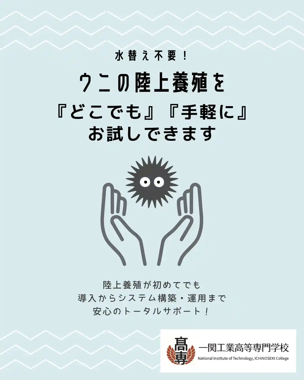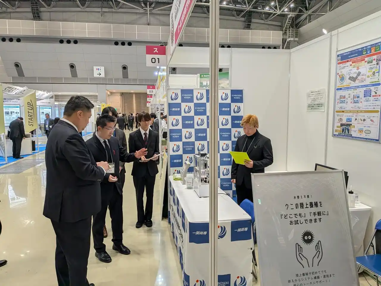 一関工業高等専門学校(岩手県一関市 校長:小林 淳哉 以下「一関高専」)化学・バイオ系渡邊崇教授の研究室では、日本が直面する温暖化と食料問題の解決に向け、閉鎖循環式陸上養殖技術を活用した研究開発に取り組んでいます。このたび、令和7年11月26日(水)から28日(金)の3日間、東京ビッグサイトで開催された「アグリビジネス創出フェア2025」(主催:農林水産省)に、特許技術であるオゾン浄化を搭載した超小型閉鎖循環式陸上養殖システムを出展しました。 |