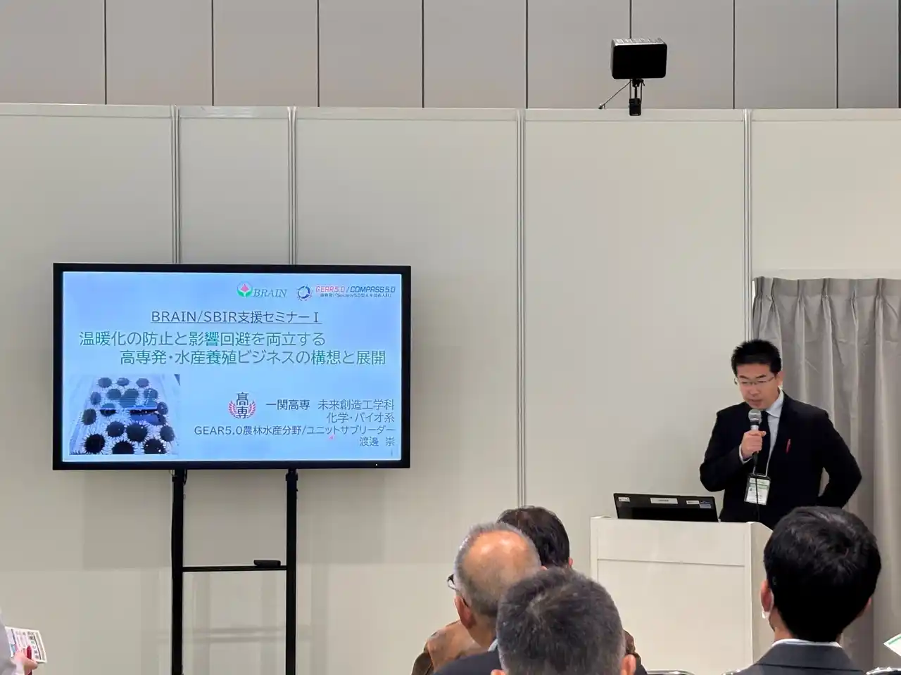 また、スタートアップ総合支援プログラム(SBIR支援)主催のセミナーでは、渡邊教授が高専発の水産養殖ビジネスにおける技術シーズを発表し、産業界からも注目を集めました。 |