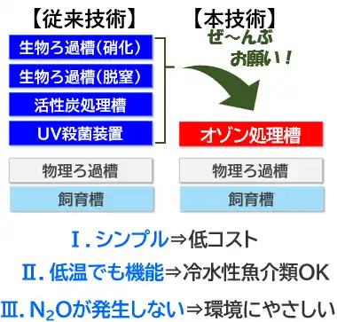 渡邊研究室では、令和4年度から「みどりの食料システム戦略」に基づき、オゾン浄化システムを中核としたウニの完全閉鎖循環式陸上養殖システムの開発を進めています。本研究で開発した特許技術であるオゾン浄化は、アンモニアの脱窒、殺菌、脱色、脱臭、プランクトンの殺処理を一括で行うことが可能な技術です。 |
