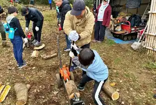 参加者全員で間伐作業として一本の大きな木を倒し、薪づくりまで体験できたことで、充実した時間となった。 |