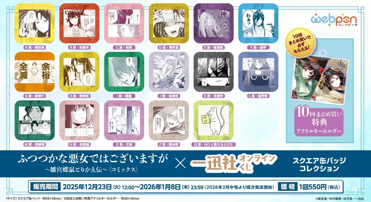 | 記念グッズ第1弾として、ノベル版アクリルキーホルダーコレクション&コミカライズ版スクエア缶バッジコレクションが一迅社オンラインくじに登場! | ||||||||||||||||||||||||
