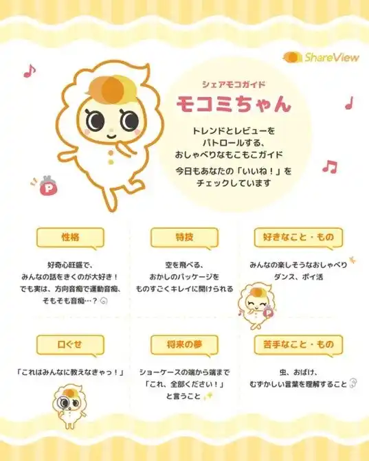 モコミちゃんは、明るく好奇心旺盛な性格で、気になる新商品をチェックしたり、みんなの感想を見たりすることが大好きなキャラクター。シェアビューの楽しさや魅力をわかりやすく伝えるビジュアルキャラクターとして活用していきます。 |