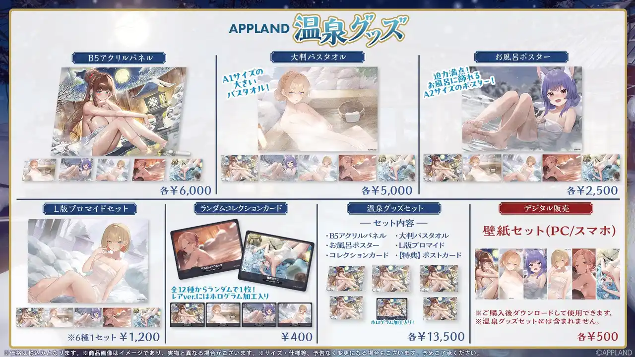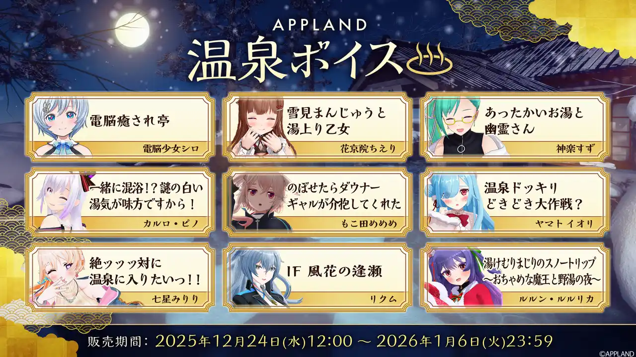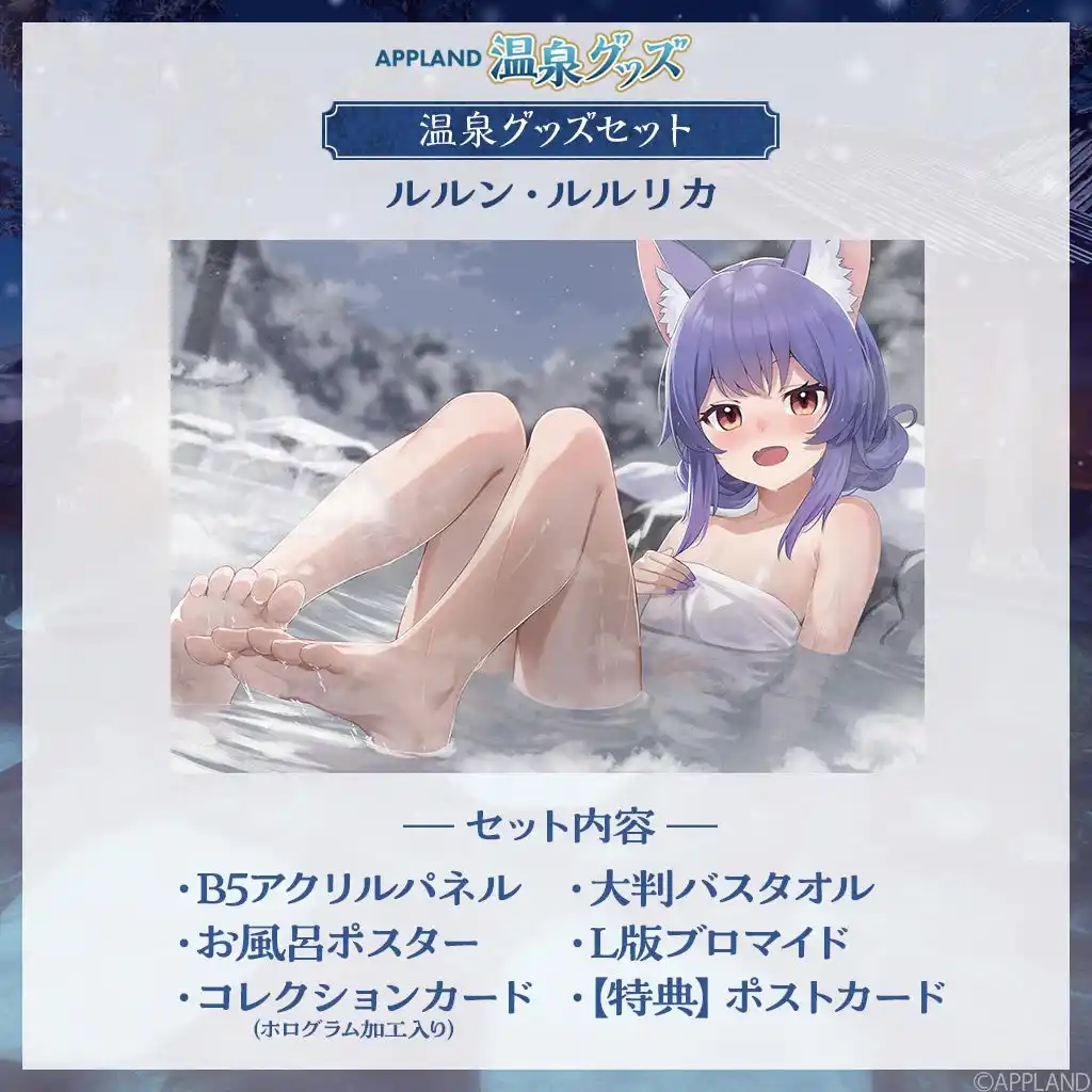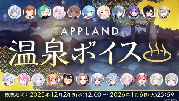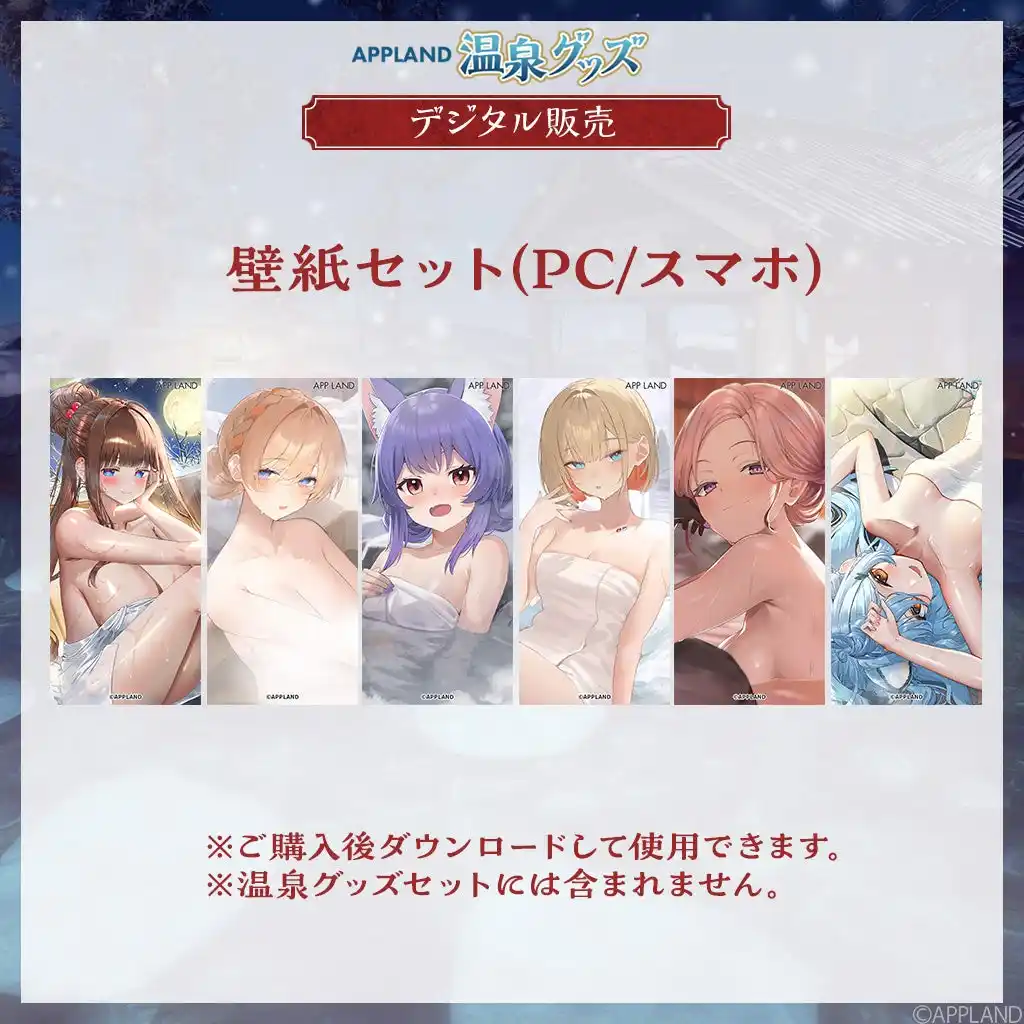 株式会社アップランド(本社:東京都世田谷区、以下「当社」)が運営する「.LIVE」・「ぶいぱい」メンバー合計6名の『APPLAND温泉グッズ』、および合計23名が参加する『APPLAND温泉ボイス』をAPPLAND OFFICIAL SHOPにて販売することをお知らせします。 |