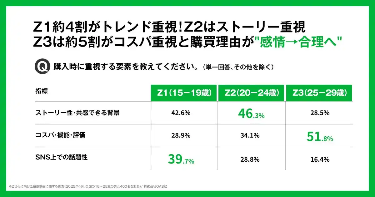Z1約4割がトレンド重視!Z2はストーリー、Z3は約5割がコスパ重視と購買理由が感情→合理へ |