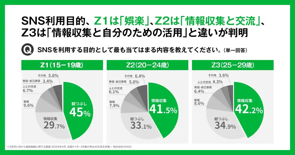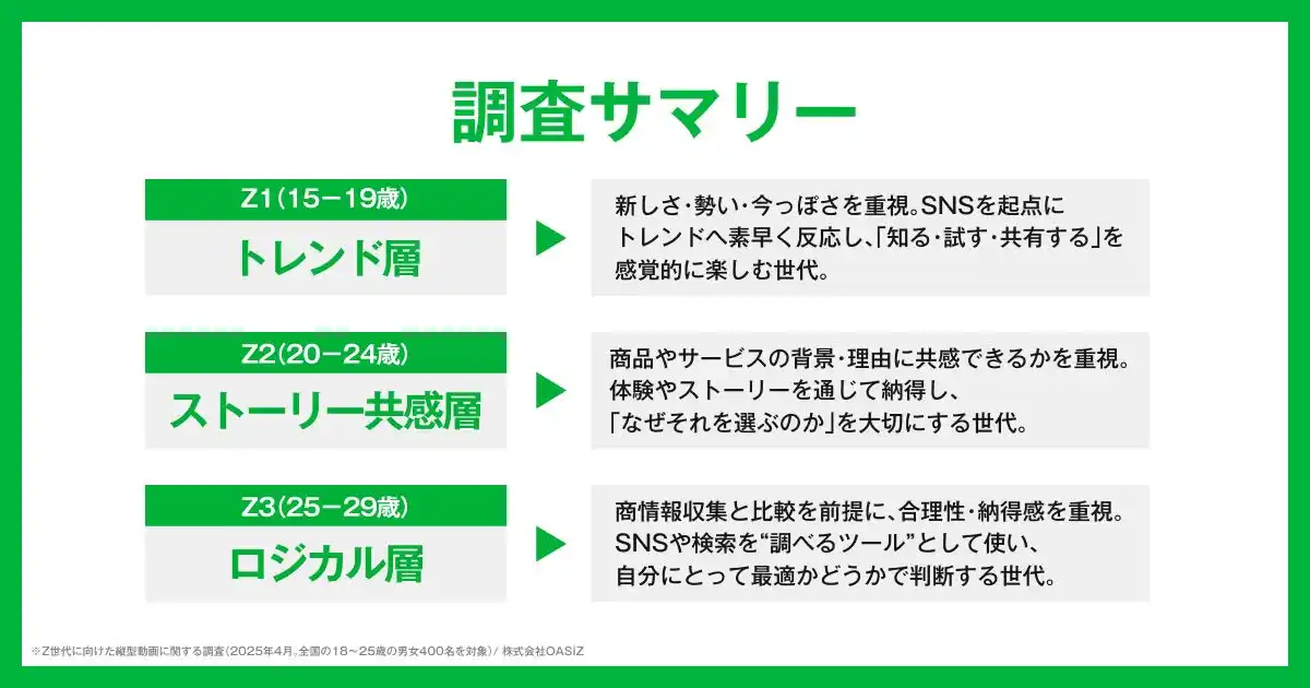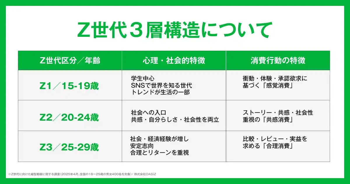 TikTokなどの縦型ショート動画に特化したネクストジェネレーションカンパニー、株式会社OASIZ(本社:東京都渋谷区、代表取締役社長:江藤 優、以下、OASIZ)は、全国の15~29歳の男女を対象に「Z世代の消費意識・SNS利用実態」に関する調査を実施。一括りに語られがちなZ世代ですが、本調査の分析を通じて、「Z1(15~19歳)」「Z2(20~24歳)」「Z3(25~29歳)」の3層において、消費行動や価値観に明確な違いがあることが明らかになりました。トレンドで即購入する“Z1”、ストーリーで選ぶ“Z2”、比較検討で納得して買う“Z3”、一括りでは語れない“3層Z時代”の実態をお伝えします。 |