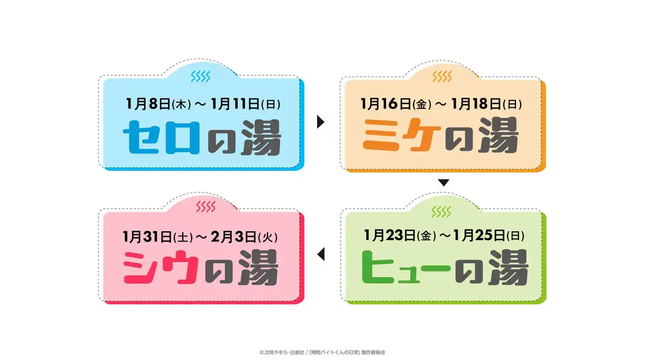 当社子会社の株式会社極楽湯(本社:東京都千代田区、代表取締役社長:佐藤 剛史)および株式会社GK Marketing(本社:東京都千代田区、代表取締役社長:山本 真司)は、2026年1月8日(木)より極楽湯 多摩センター店で、TVアニメ「拷問バイトくんの日常」とのコラボキャンペーン“スピリタスのごくらく慰安旅行”を開催いたします。 |