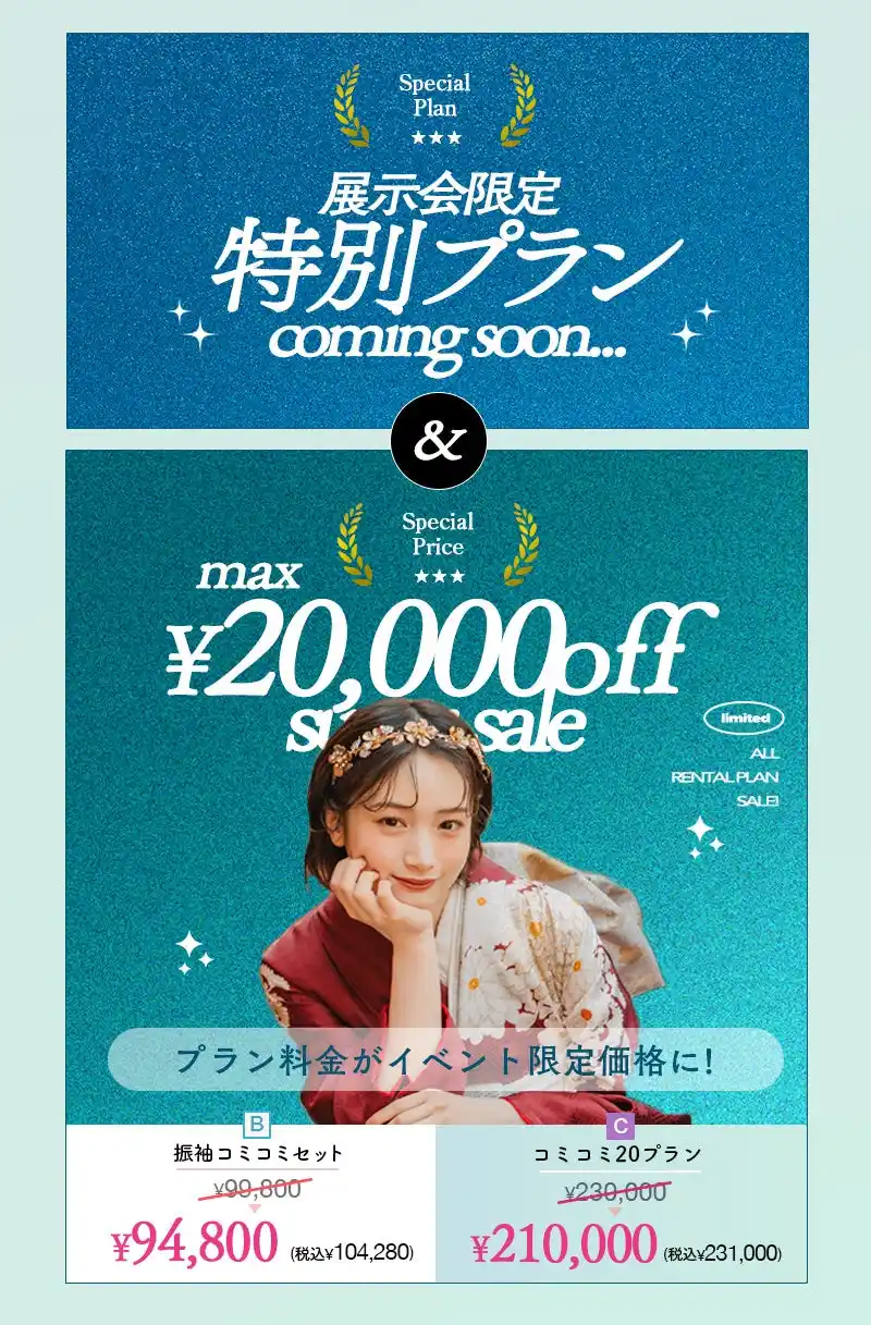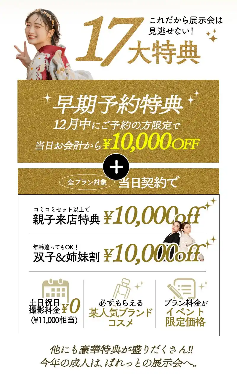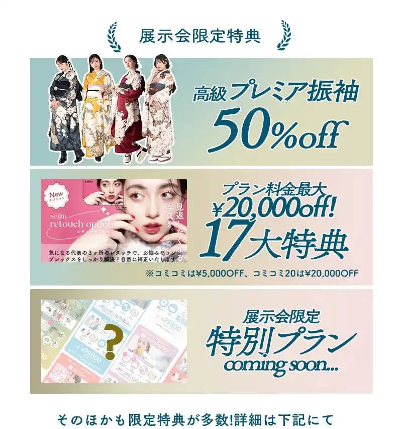 展示会に一歩足を踏み入れた瞬間から、あなたの成人式準備はもっと楽しくなります。今しか受け取れない、夢を叶える豪華な特典をご用意しました。 |