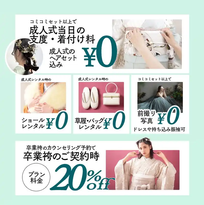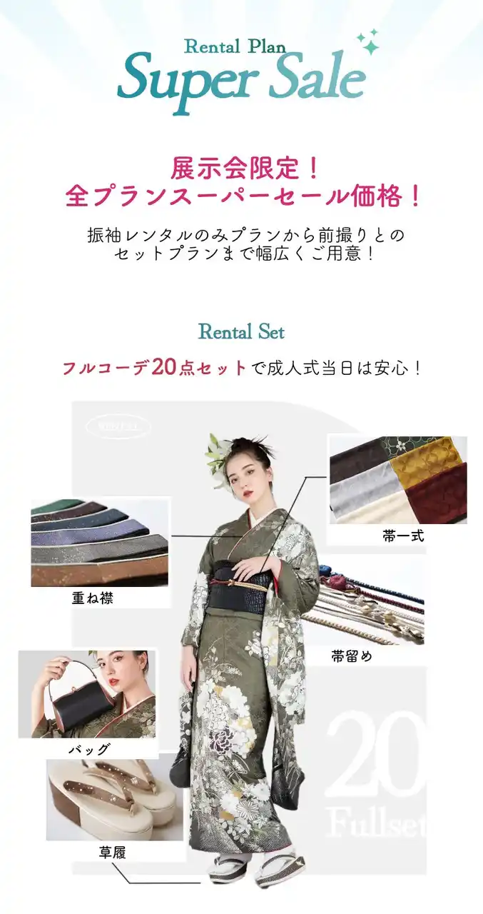 「お母さんの振袖を着たいけれど、自分らしくもしたい」そんな温かい想いを全力で応援します。最新の小物で可愛くアレンジするコーディネートオプションも、イベント限定の大幅割引でご提案します。 |