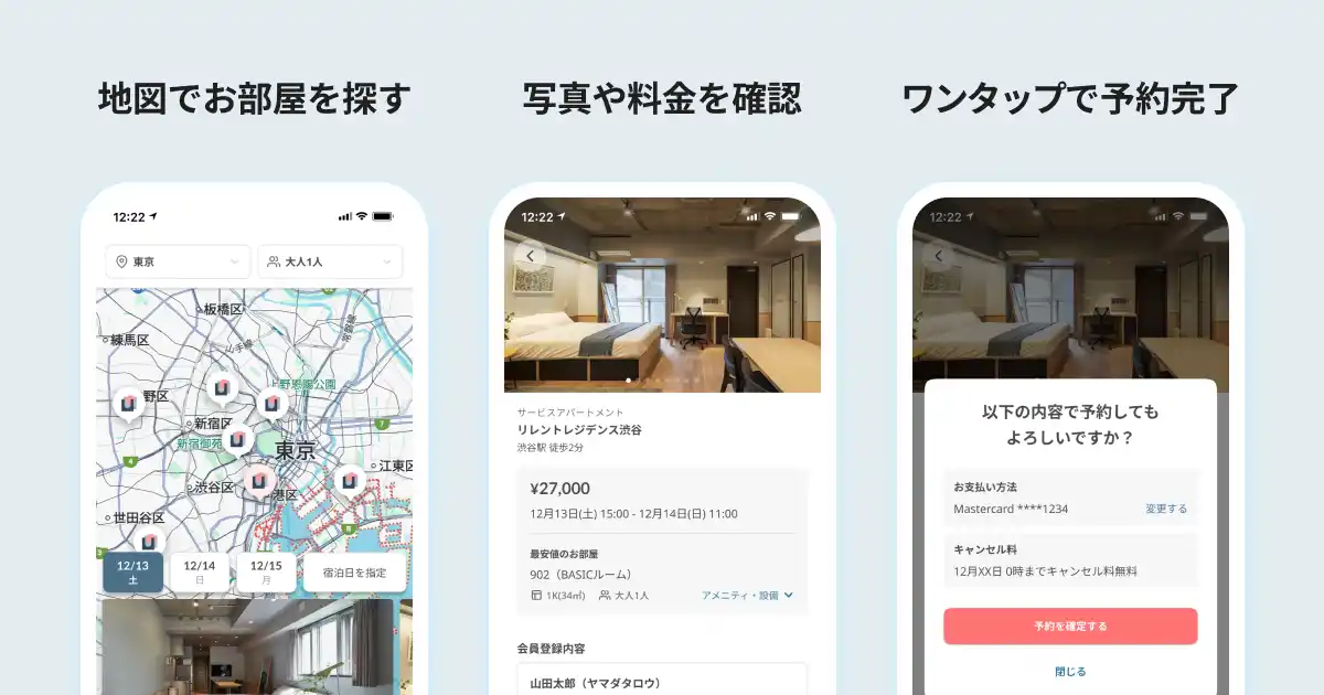 地図からエリアと宿泊日を選ぶだけで、宿泊可能なお部屋を一覧表示。駅からの距離や周辺環境も視覚的に確認でき、空室状況や最短翌日から泊まれるお部屋がひと目で分かります。出張や急な予定変更など、「今すぐ泊まりたい」にも対応できる、直感的で迷いのない探しやすさが特長です。 |