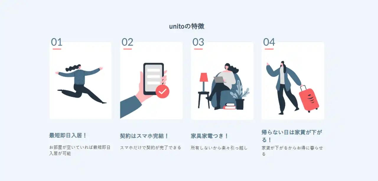 「unito」は、オンラインで契約を完結でき、最短即日で入居可能な部屋探しができるプラットフォームです。掲載されている部屋には、通常の賃貸で必要な家具・家電に加え、Wi-Fiや生活必需品も完備されており、スーツケース1つで手軽に引っ越しできます。 |