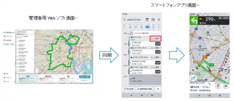 Webソフトで作成した巡回ルートは、スマートフォンアプリに自動的に同期されます。乗車したドライバーは、スマートフォンのスケジュール画面をワンタップするだけで、訪問ルートを確認して出発できます。 |