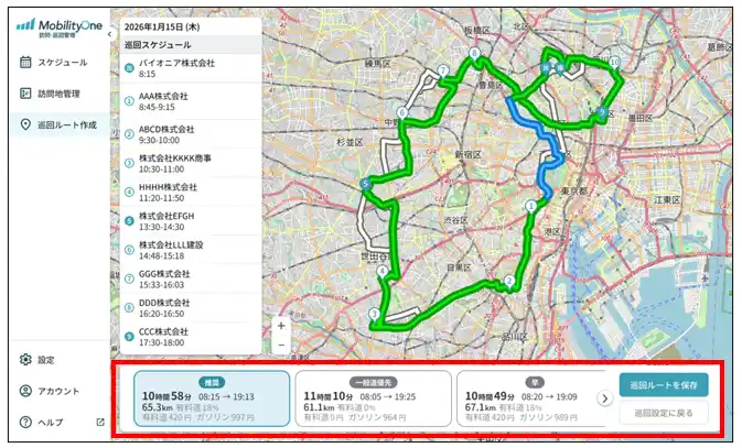 最大25件の訪問先を効率よく回れるルートを自動で作成します。 |