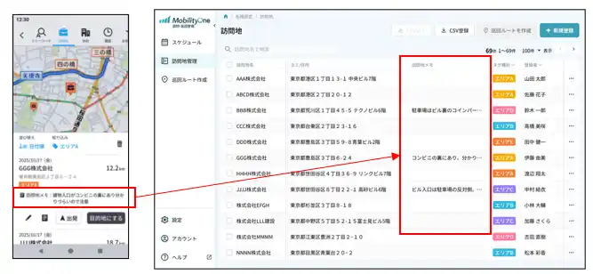【訪問地メモを組織内でリアルタイムに共有可能】 |