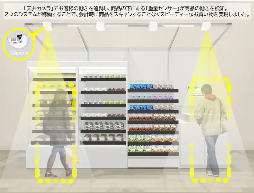 今回導入したTTG 社の無人決済システムは、店内に設置したAIカメラと重量センサーがお客様と手に取った商品をリアルタイムに認識することで、レジでの商品スキャンを不要にする画期的な仕組みです。これにより、従来の有人レジやセルフレジよりもスピーディーで快適な購買体験が可能になります。 |