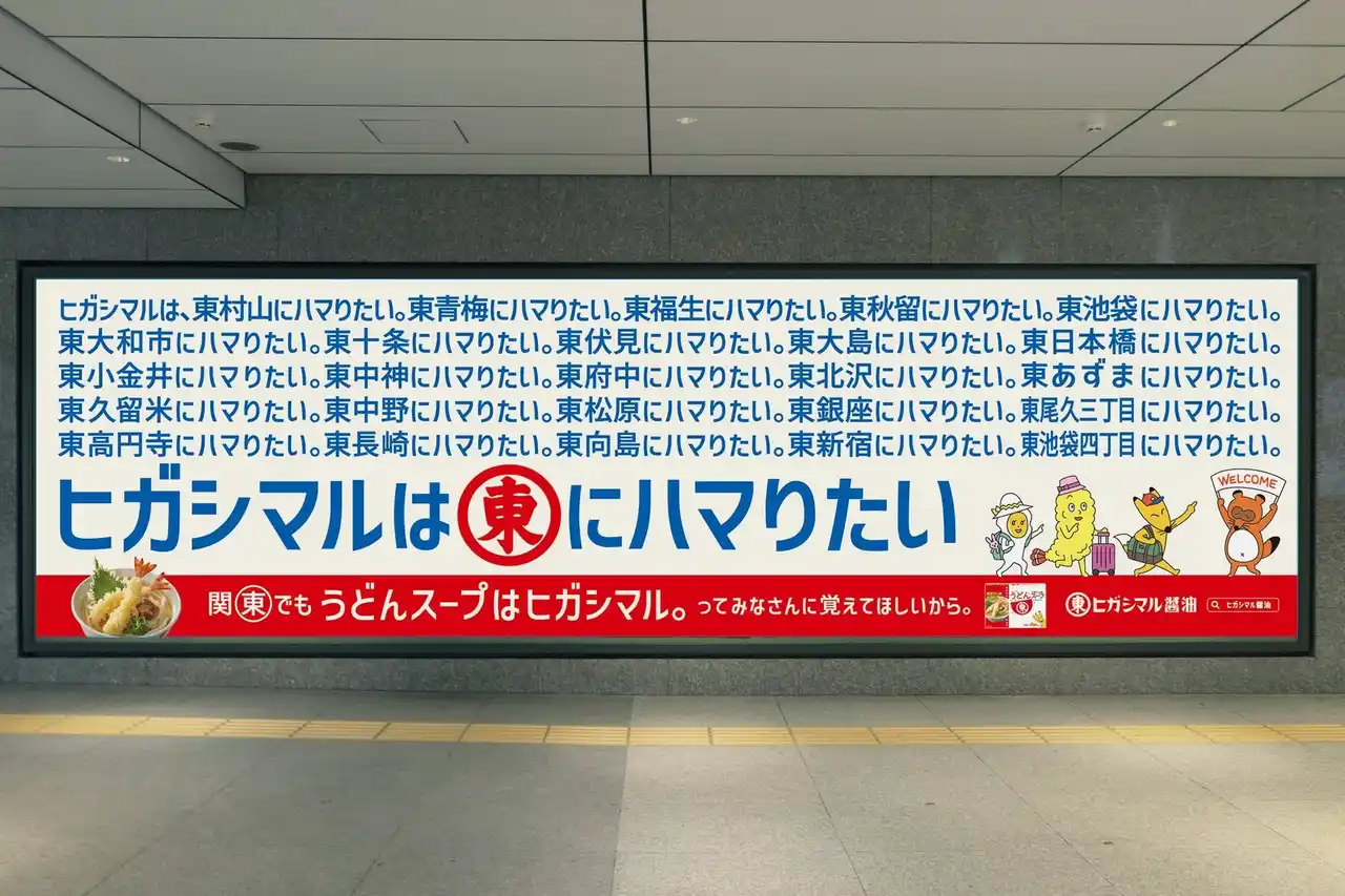 そこで、関東でさらなるファンを獲得するため「ヒガシマルは東にハマりたい」作戦を実施。社名「ヒガシマル」にちなみ東京都内の"東(ひがし)"から始まる全28駅周辺エリアに、その土地ならではのコピーとご当地バージョンに変身したCMキャラクターたちを描いた広告を掲出。 |