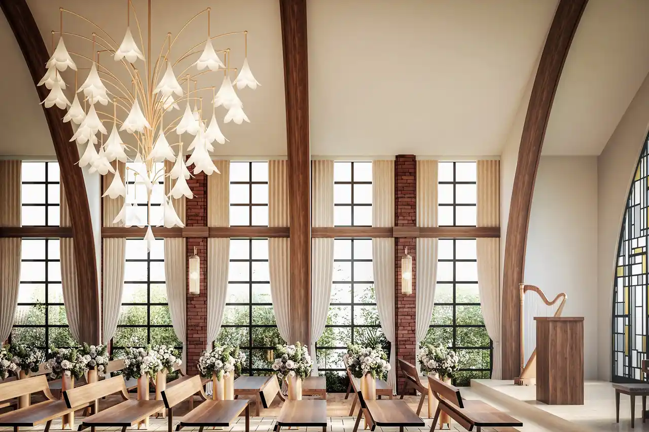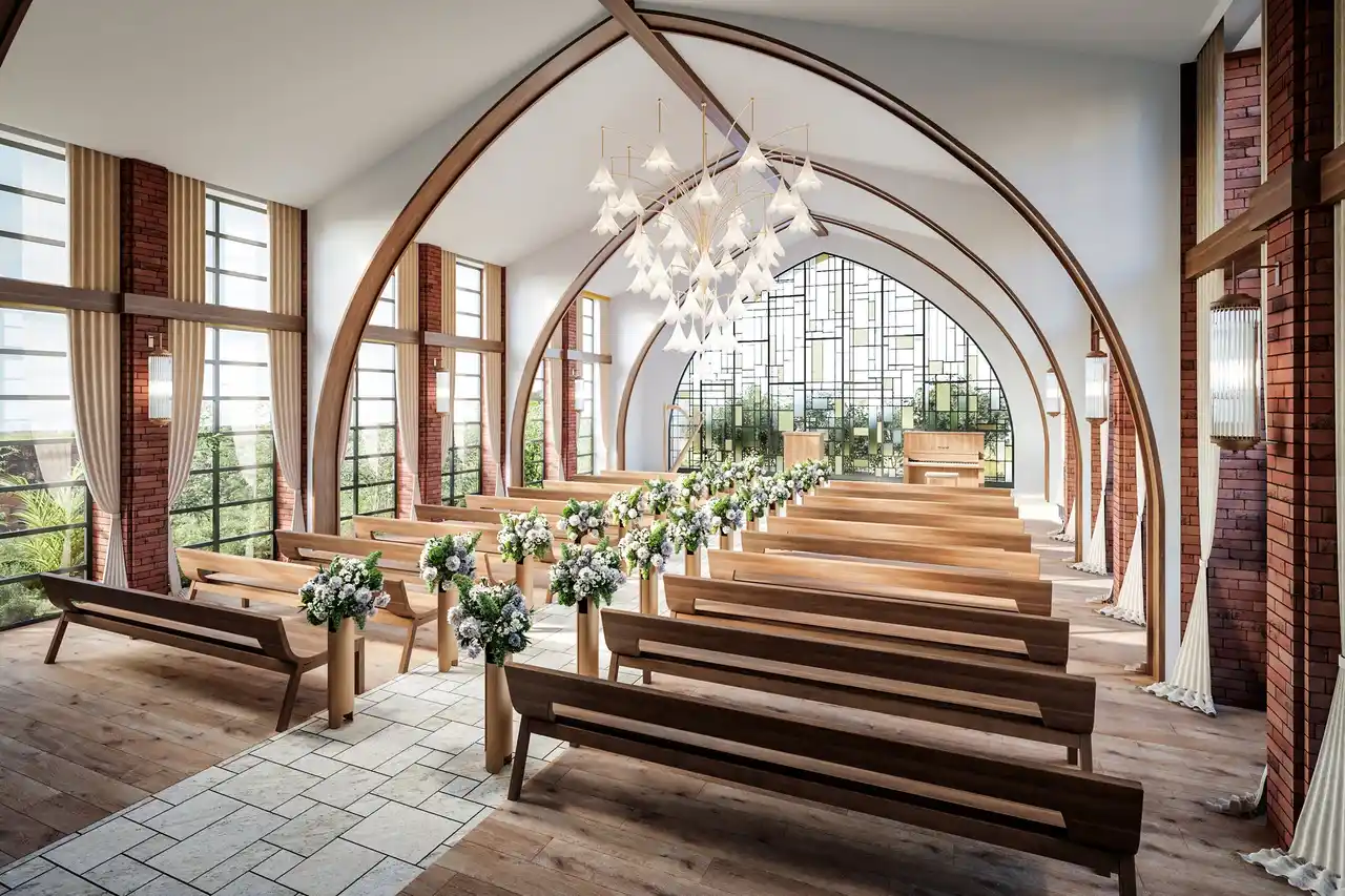 天井から自然光がたっぷりと降り注ぎ、窓からは緑が望めるチャペルをご用意しております。 木の温もりと正面のステンドグラスの輝きが、ふたりの誓いをやさしく包み込みます。 |