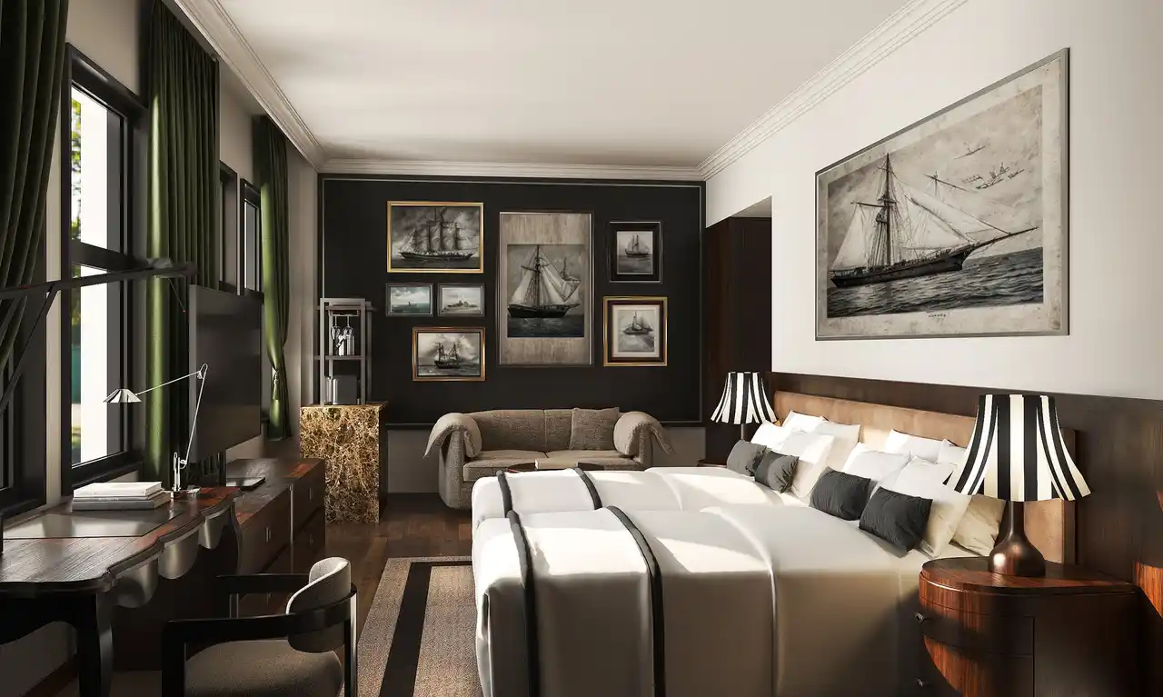 | 客室はこの物語の“個人的な航路”であり 横浜と結ばれた実在の港をテーマに、 各室の色彩と素材がその土地の記憶を象徴しております。 グリーンとレッドのベンガル、砂塵のアレクサンドリア、 デルフトブルーのワタビア、朱と漆黒のアントン、 インディゴのマルセイユ、インクグレーのボストン。 それぞれが、海を越えて往来した文化の断片を宿すように。 | |||||||||