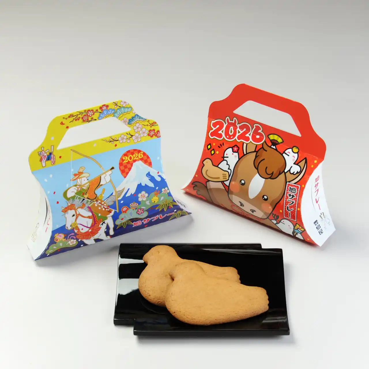干支をデザインした限定パッケージです。キュートな馬が主役のデザインと、流鏑馬を描いたデザインの2種類をご用意しています。価格:各616円(1箱、4枚入) |