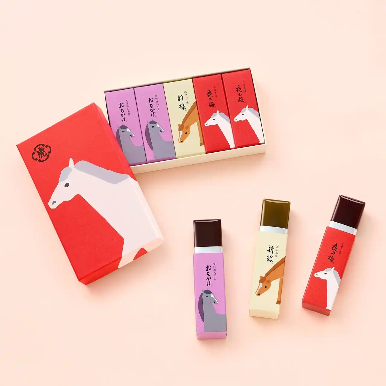 新年にふさわしい華やかな紅色を背景に、優しい表情のゆったりとした馬の姿を配した限定の化粧箱に、干支パッケージの小形羊羹を詰め合わせました。 |