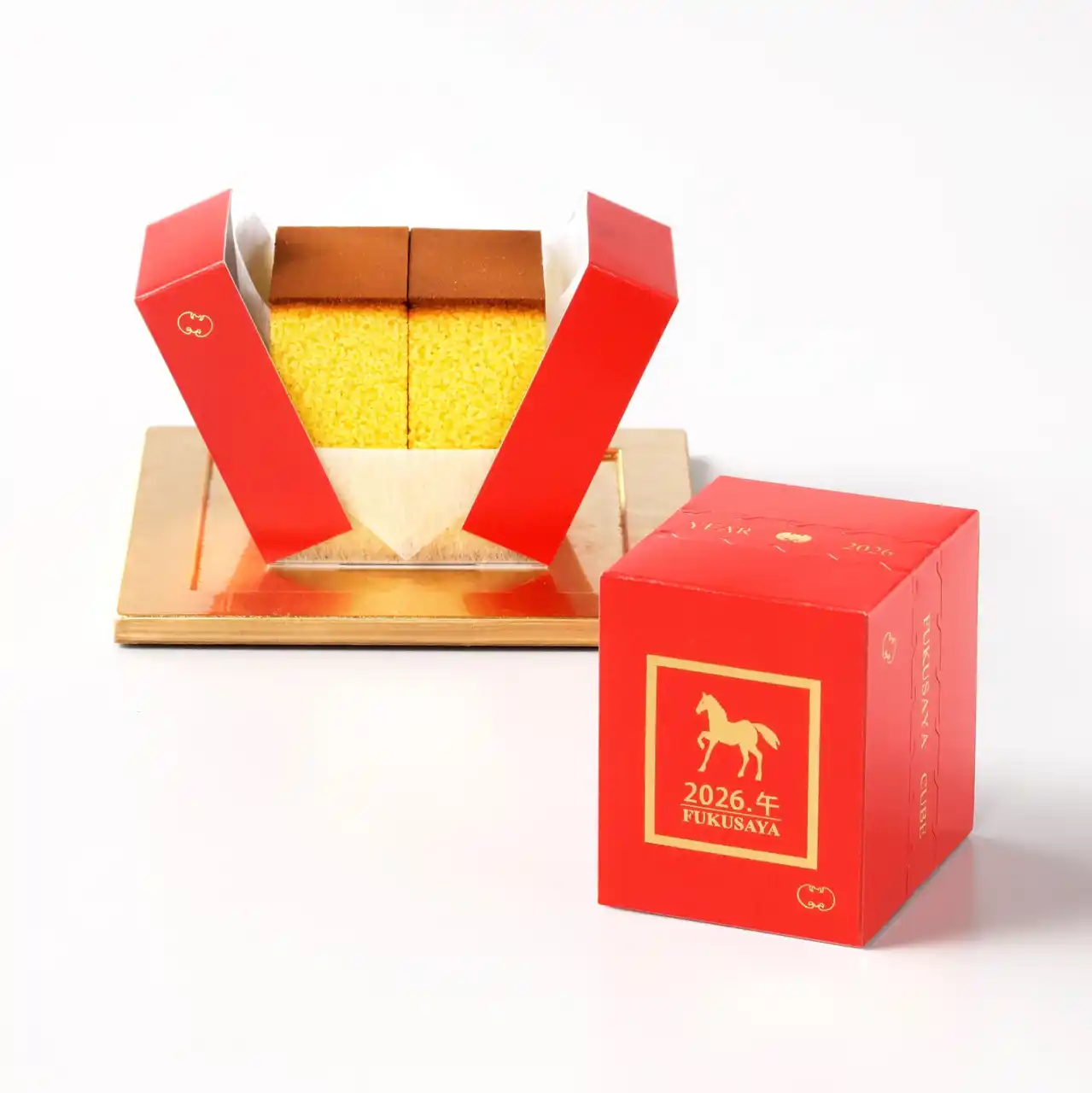熟練した職人がひとつひとつ手づくりで作る伝統のカステラを、手軽にお楽しみいただける小箱「フクサヤキューブ」。干支柄の限定パッケージでご用意いたしました。 |