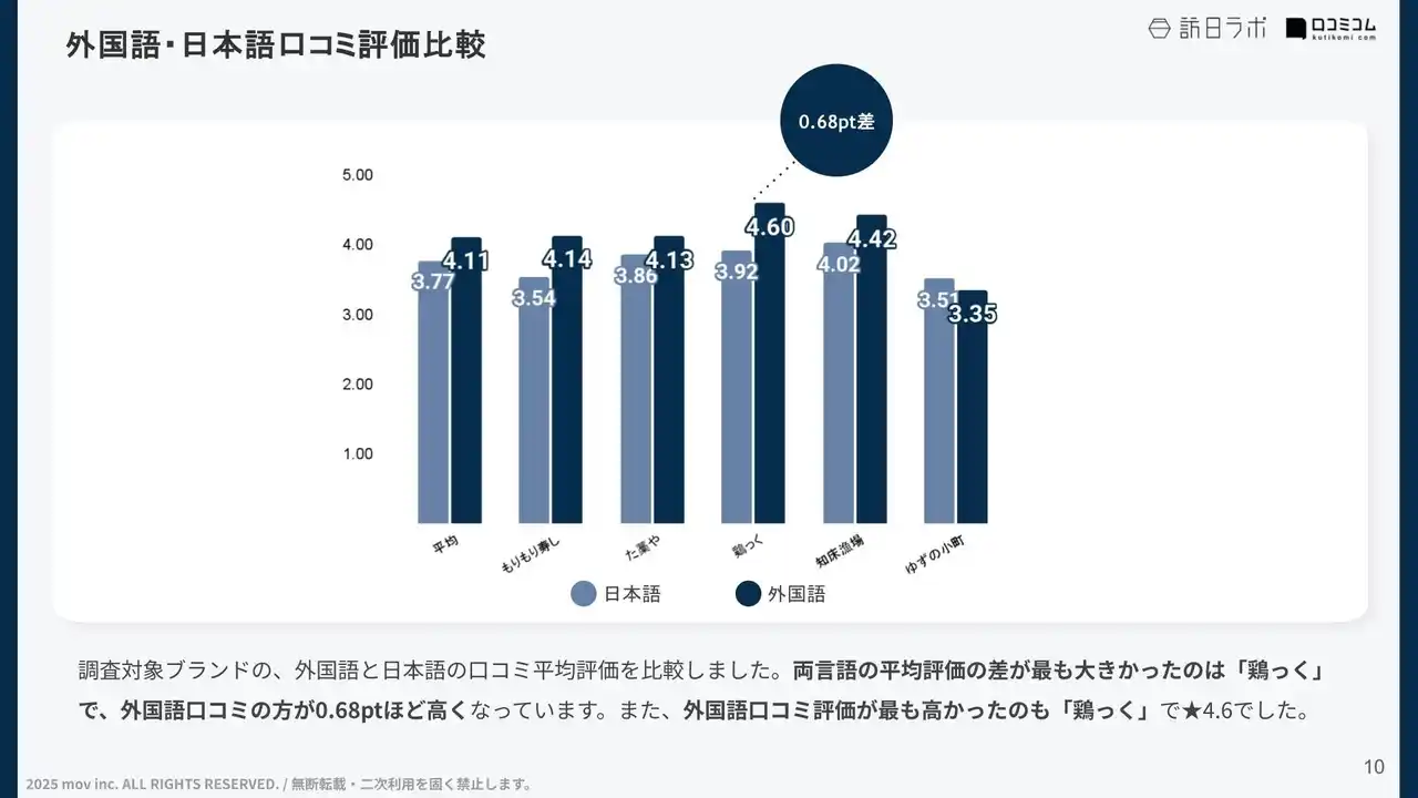 調査対象ブランドの、外国語と日本語の口コミ平均評価を比較しました。両言語の平均評価の差が最も大きかったのは「鶏っく」で、外国語口コミの方が0.68ptほど高くなっています。また、外国語口コミ評価が最も高かったのも「鶏っく」で★4.6でした。 |